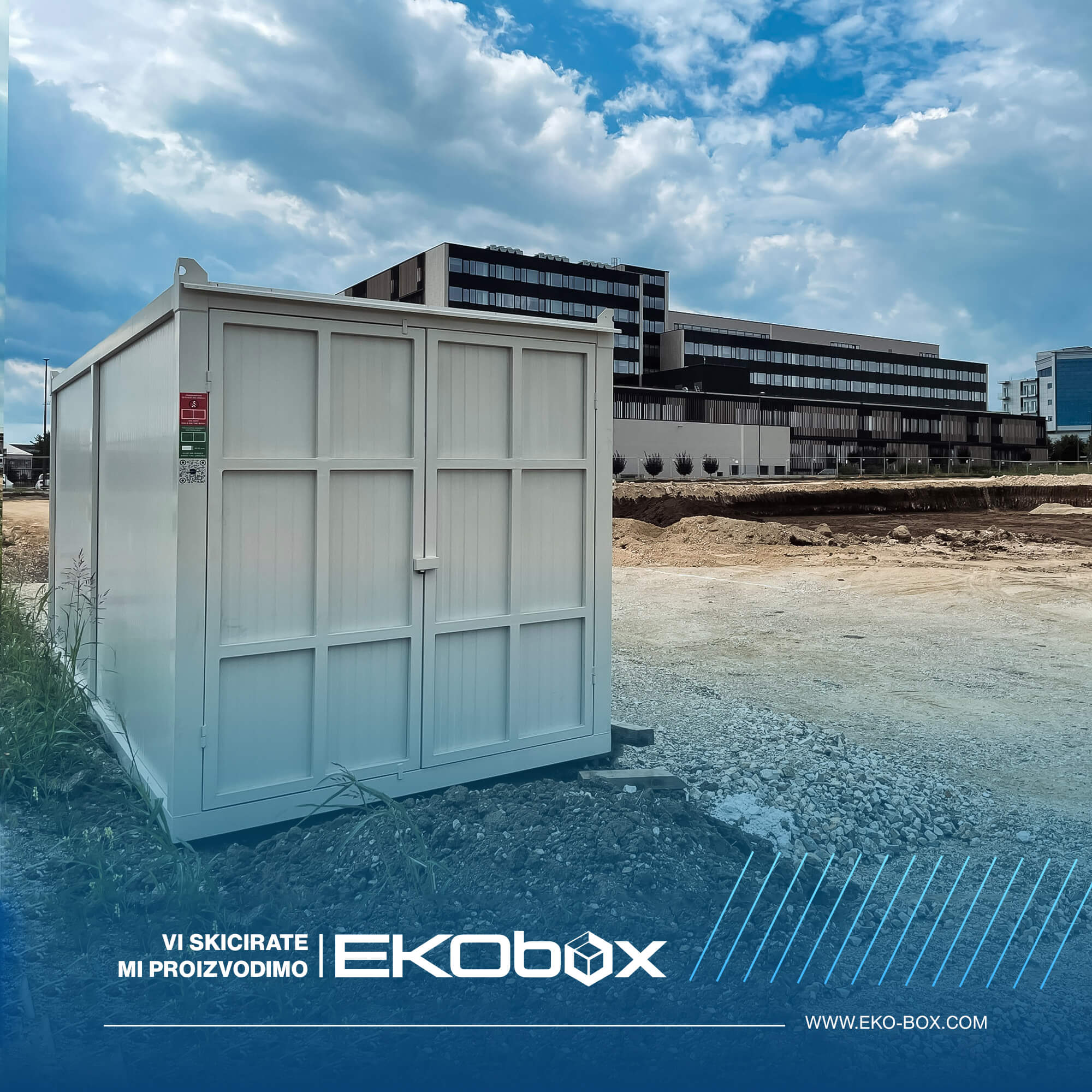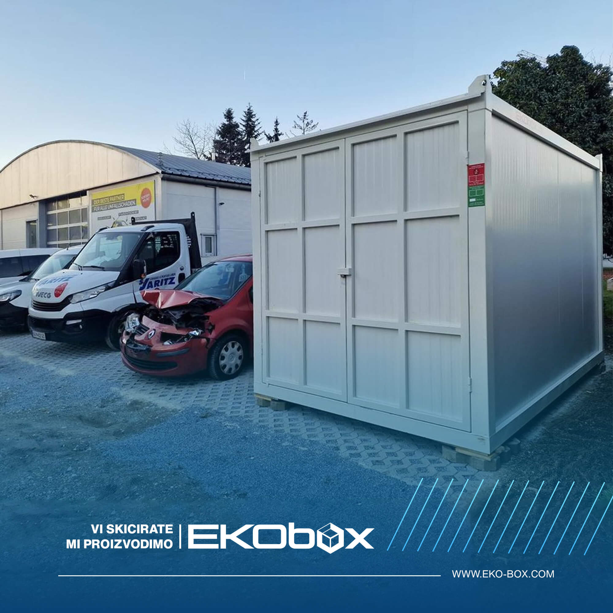 Skladiščni kontejner standardnih dimenzij se uporablja za shranjevanje odvečnih stvari ali orodja na gradbiščih in predstavlja učinkovito rešitev za skladiščenje.
